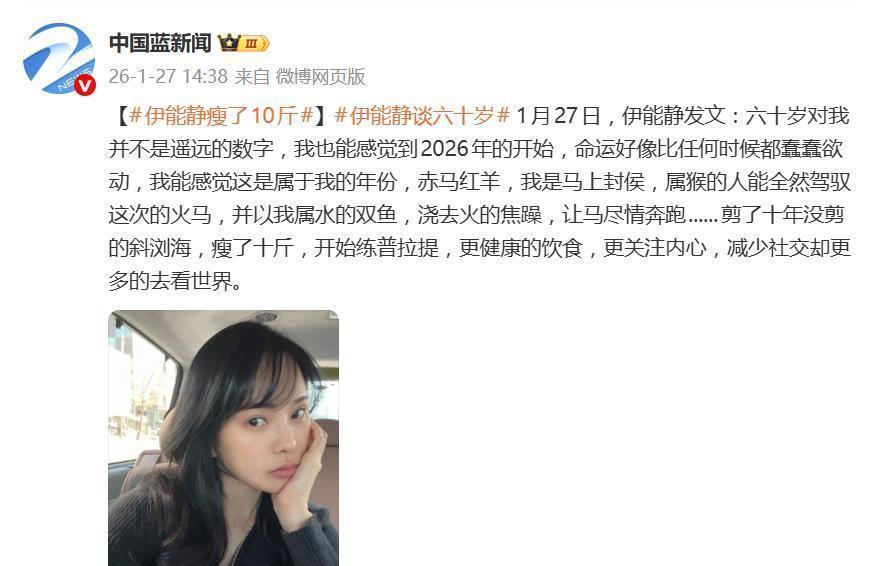 据1月27日报道,伊能静一篇关于六十岁的长文,又让她稳稳占据了话题中心。文中那句“剪了十年没剪的斜刘海,瘦了十斤”,配上她“野心勃勃地、向最大的可能跃进”的宣言,瞬间点燃了评论区——这状态,哪像传统印象里即将步入花甲之年的人?