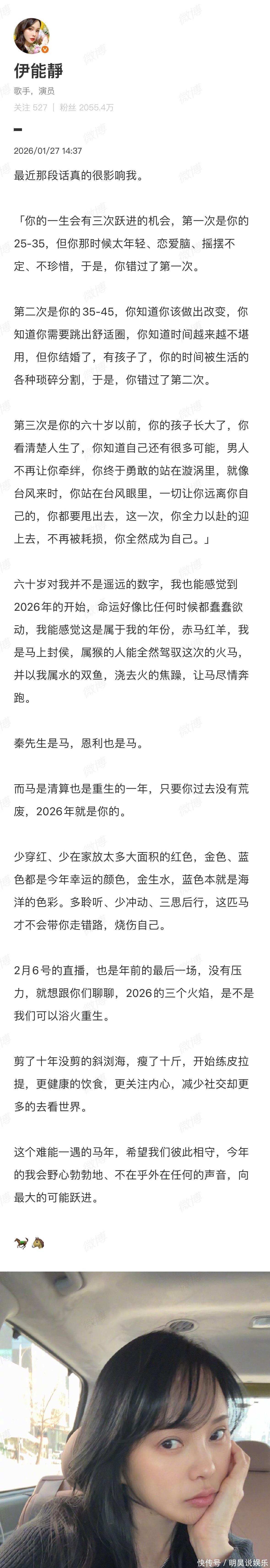 整篇小作文信息量不小,核心围绕着一段“深深影响她”的话展开。这段话将人生划分为三次关键的“跃进”机会:第一次在25-35岁,却因年轻和恋爱脑错过;第二次在35-45岁,又被婚姻和育儿的琐碎牵绊;而第三次,就在六十岁之前。此时孩子已长大,人生已然通透,终于能“站在台风眼里”,甩开一切耗损,“全然成为自己”。伊能静显然把自己精准代入了这“第三次跃进”。她直言六十岁对她“并非遥远数字”,并神秘兮兮地搬出了一套“玄学”解读。她将2026年(她满六十岁的年份)定义为属于自己的“赤马红羊”之年,更结合自己属猴、双鱼座的特性,宣称能“驾驭火马”,让命运之马尽情奔跑。她还特意提到丈夫秦昊和儿子哈利(恩利)都属马,暗示家庭将与她的“重生之年”同频共振。